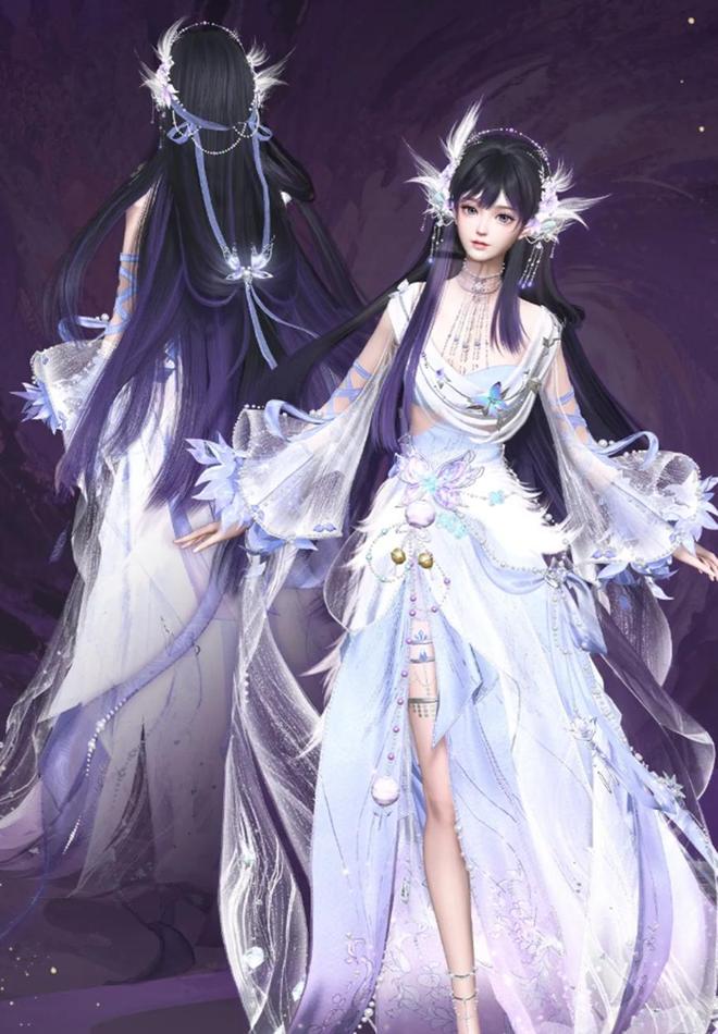 而女款时装则更吸引人眼球了,如果说大圣的衣服处处透着少年意气,那么以紫兰为原型的女款则显得温柔动人!紫色的主色调优雅无比,而白色轻纱和蕾丝的设计则更让这套时装显得空灵柔美,仿佛穿着它的少侠也化为仙子一般,令人怜爱。