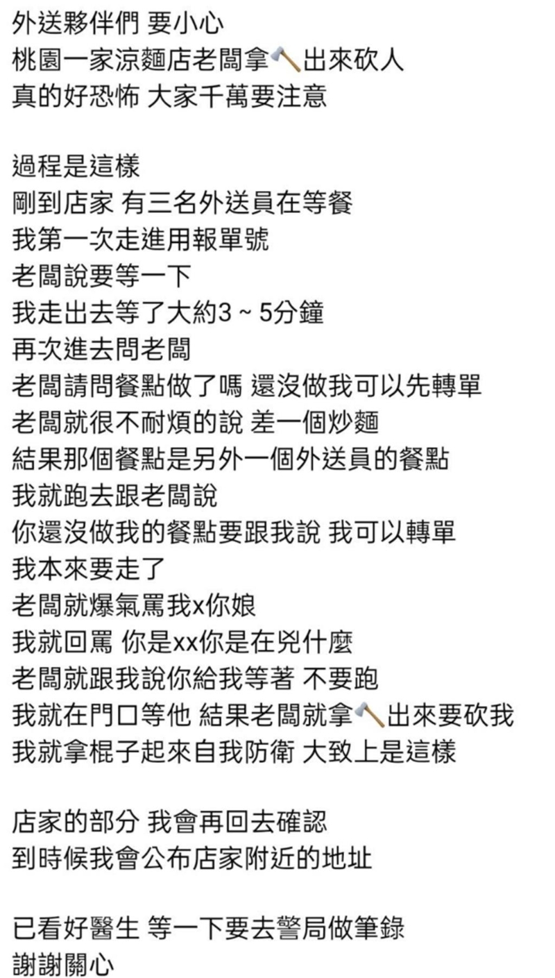 “外送伙伴要小心!”邓姓熊猫外送员在网上抱怨,昨晚6点多前往永安北路某凉面店家取餐时,看到已有3名外送员在等餐,老板说要等一下,他等了3至5分钟询问老板若餐点还没做他可以转单,老板称还差一个炒面,没想到完成后才知那是另一个外送员的单,他再次表达要转单,岂料老板就骂三字经,他也回呛,老板放话:“你给我等着!”随即拿起斧头要砍人,他则拿出甩棍自卫,他并附上衣服沾满鲜血的照片,引发网友热议。