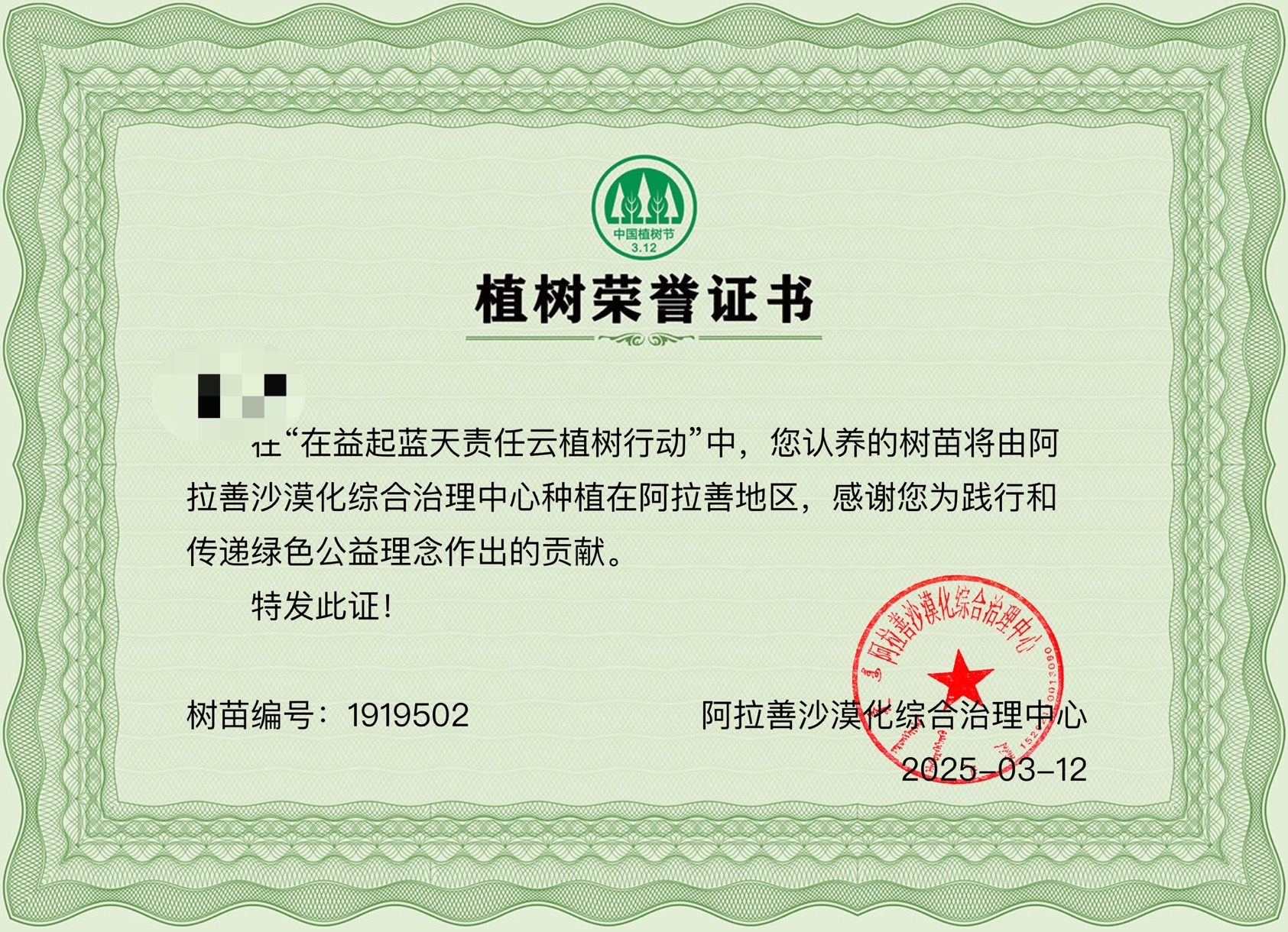 即日起,全民仍可通过“蓝天责任·云植树”小程序继续参与行动。个人、家庭、企业或机构均可线元,含三年种植养护费用),创建专属的“家庭林”“企业林”等集体林地。成功认养者将获得电子植树证书与定制纪念铭牌,记录这份跨越山河的绿色贡献,此外,部分参与者将有机会受邀成为“阿拉善守护志愿者”,亲赴沙漠见证树苗成长,亲手为小树培土浇水,让守护行动从云端走进现实。