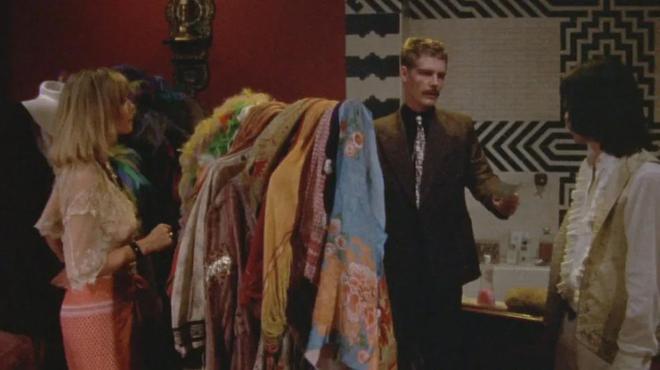 可以说,当时——七十年代——世界上最美丽的女孩、滚石乐队的缪斯安妮塔·帕里博格徘徊在米克·贾格尔的馆似的马拉喀什新潮公寓,观众几乎可以看见她狐皮与绸缎之下的裸体。詹姆斯·福克斯饰演萨维尔大街裁缝店中时髦的在逃犯,而米克·贾格尔则是典型的哥特形象,仿佛他在为摇滚乐队 Jane’s Addiction的主唱这一角色试镜。