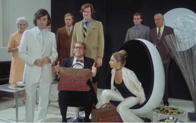瑞安·奥尼尔扮演的是她的戴着杰瑞·刘易斯式的毛呢领结的科学家恋人,而玛德莲·卡恩则在片中扮演他那强势傲慢的未婚妻,她穿着各式各样吓人的、带有大雏菊图案的双面针织毛衣。整部电影就像罗温和马汀六十年代末七十年代初的喜剧《嘲笑》中的墙纸一样明亮有趣。